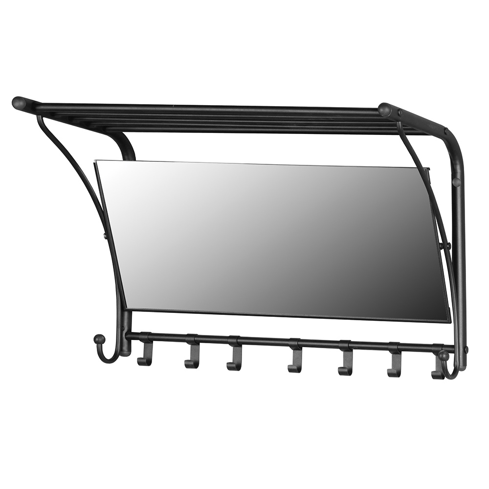 Вешалка выполнена из металлических труб диаметром 25,16 и 10мм. Крючки для одежды выполнены из 2х мм листовой стали и перемещаются по направляющей. Зеркальное полотно поворачивается по центральной оси и содержит фиксатор угла поворота. Крепление к стене за счет дюбеля. Технологические отверстия для крепления к стене имеют пластиковые заглушки.