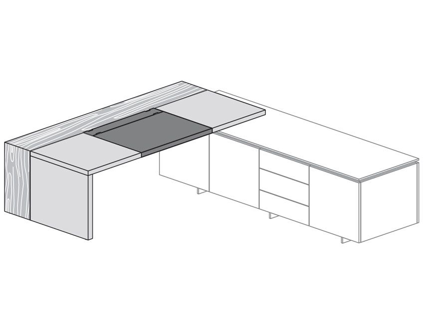 Толщина столешниц и опор - 50 мм, профиль - металлический хромовый матовый, кабель-канал - экокожа. Бювар - экокожа, столешница - лакировка матовая, фронтальная вставка - шпон