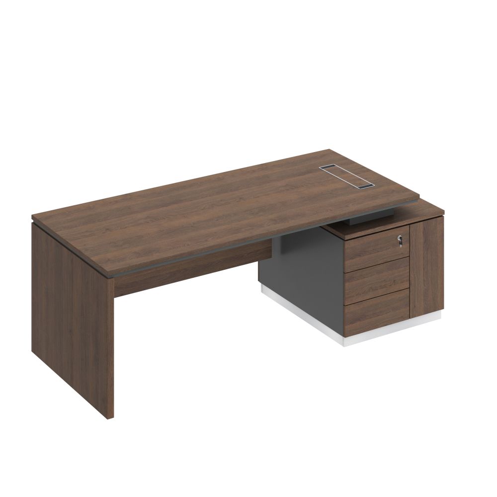 - Со стороны Пользователя опорная тумба имеет 3 выдвижных ящика, установленных на скрытые шариковые направляющие с системой встроенного демпфирования и нишу под системный блок компьютера со скрытым размещением проводки, укомплектованную распашной дверью с системой открывания Push Up (без ручек).