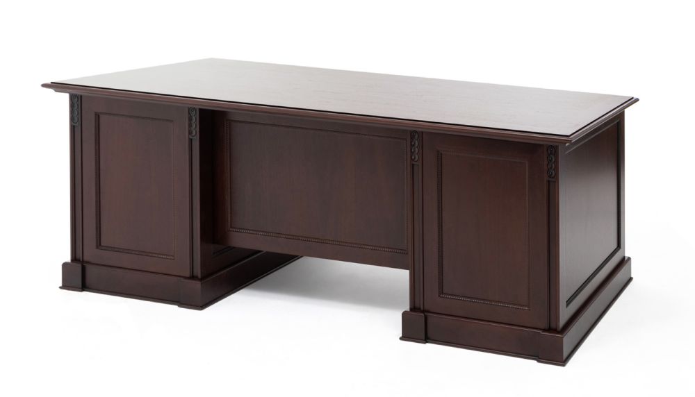 Теплая текстура натурального дерева создает в офисе благоустроенность, а глубокий цвет ореха Танганьика и рельефная резьба делают интерьер похожим на кабинеты с богатой историей. Выдержанный классический стиль Doge призван пробуждать ностальгические воспоминания и ощущение «уютного дома».