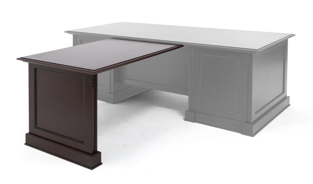 В столешнице письменного стола предусмотрен выдвижной пенал 82,4х46,6хh7 см. Фасад пенала декорирован резным молдингом из натурального дерева, внутри отделка из натуральной кожи шоколадного цвета. Пенал укомплектован шариковыми направляющими скрытого типа с плавным закрыванием.