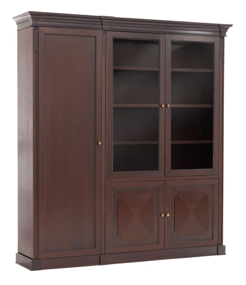 Теплая текстура натурального дерева создает в офисе благоустроенность, а глубокий цвет ореха Танганьика и рельефная резьба делают интерьер похожим на кабинеты с богатой историей. Выдержанный классический стиль Doge призван пробуждать ностальгические воспоминания и ощущение «уютного дома».
