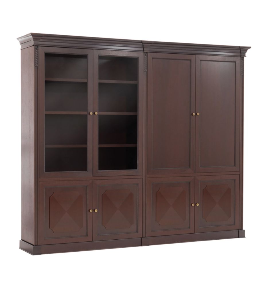 Теплая текстура натурального дерева создает в офисе благоустроенность, а глубокий цвет ореха Танганьика и рельефная резьба делают интерьер похожим на кабинеты с богатой историей. Выдержанный классический стиль Doge призван пробуждать ностальгические воспоминания и ощущение «уютного дома».