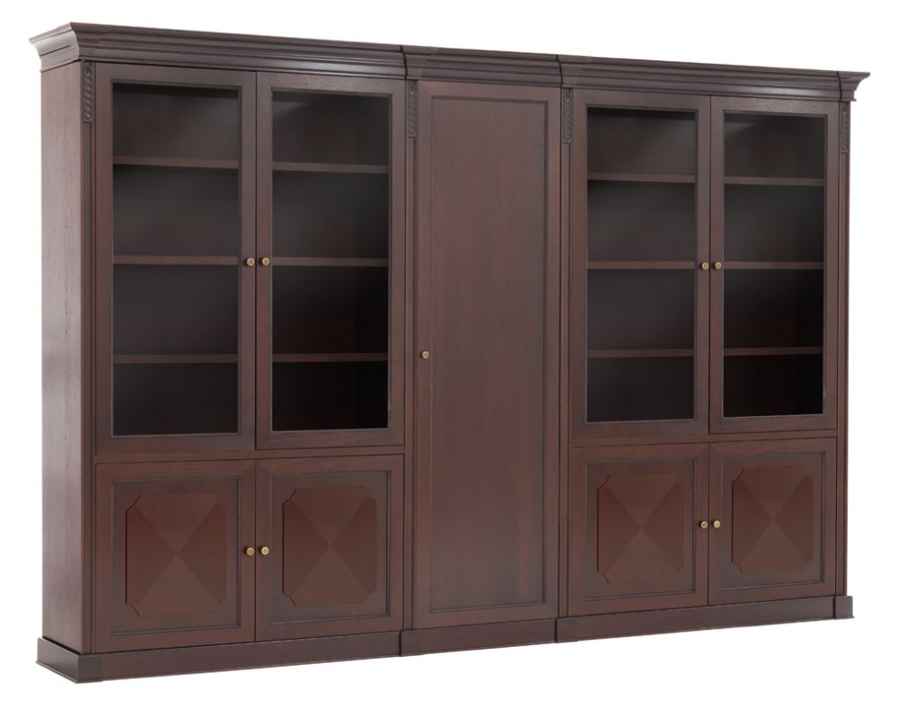 Теплая текстура натурального дерева создает в офисе благоустроенность, а глубокий цвет ореха Танганьика и рельефная резьба делают интерьер похожим на кабинеты с богатой историей. Выдержанный классический стиль Doge призван пробуждать ностальгические воспоминания и ощущение «уютного дома».