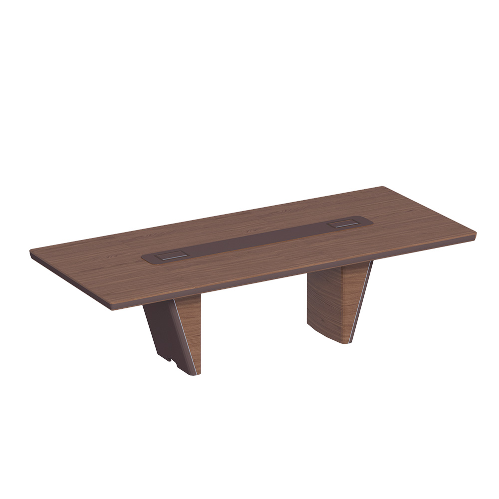 Топ и опоры дерево; мет. вставка; кромка,  внешняя часть опор и центр. часть стола в коже; 2 кабель -канала, на 10 мест