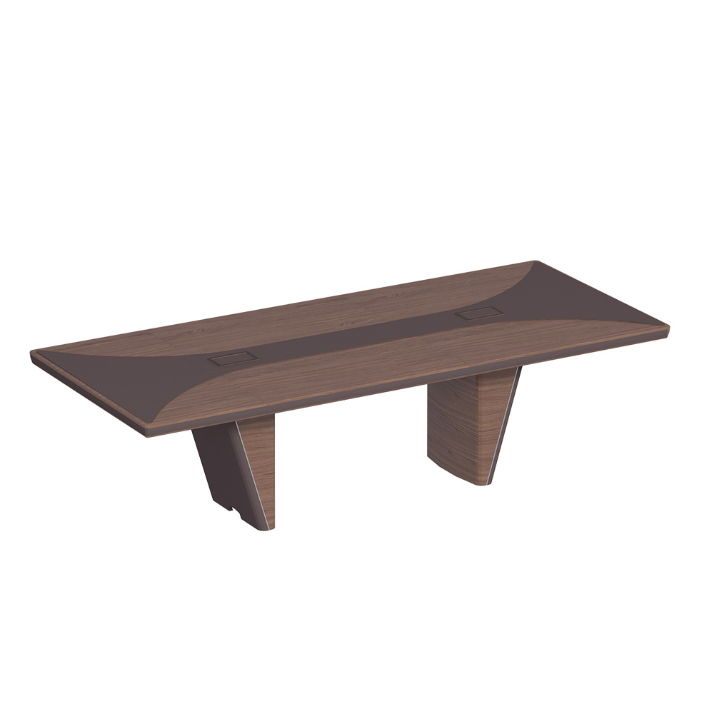 Топ и опоры дерево; мет. вставка; кромка, внешняя часть опор и центр. часть стола в коже; 2 кабель -канала, на 10 мест