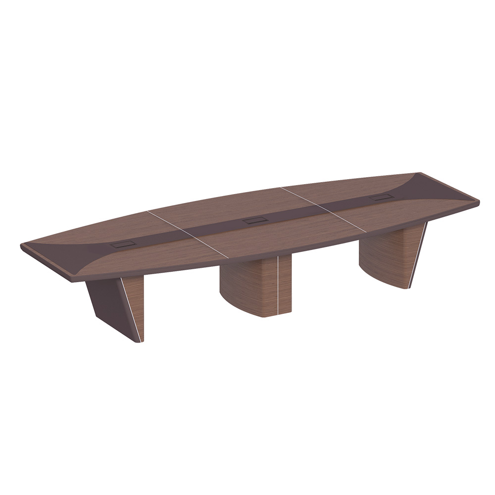 Колонна, топ и опоры дерево; мет. вставка; кромка, внешняя часть опор и центр. часть стола в коже; 3 кабель -канала, на 14 мест