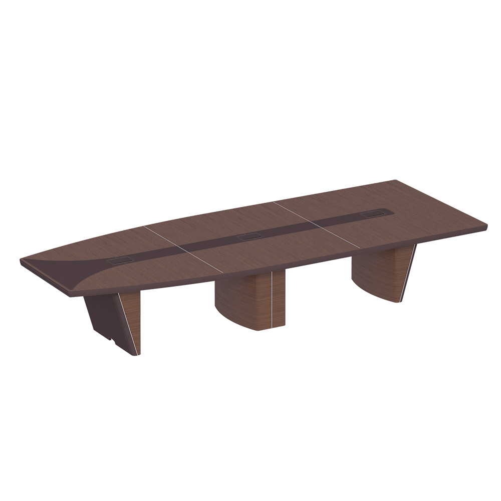 Колонна, топ и опоры дерево; мет. вставка; кромка, внешняя часть опор и центр. часть стола в коже; 3 кабель -канала, на 15 мест