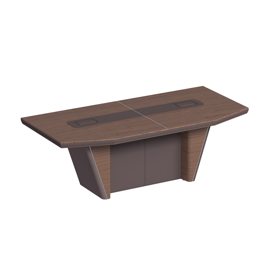 Топ и опоры дерево; мет. вставка, кромка;  внешняя часть опор, фронтальная панель и центр. часть стола в коже; 2 кабель -канала, на 6 мест