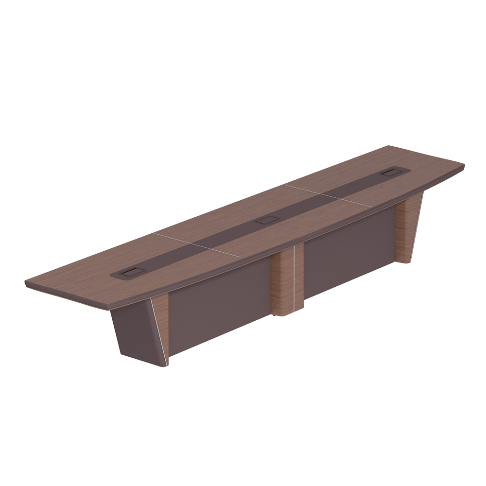 Tоп и опоры дерево; мет. вставка, кромка; внешняя часть опор, фронтальная панель и центр. часть стола в коже; 3 кабель -канала, на 8 мест