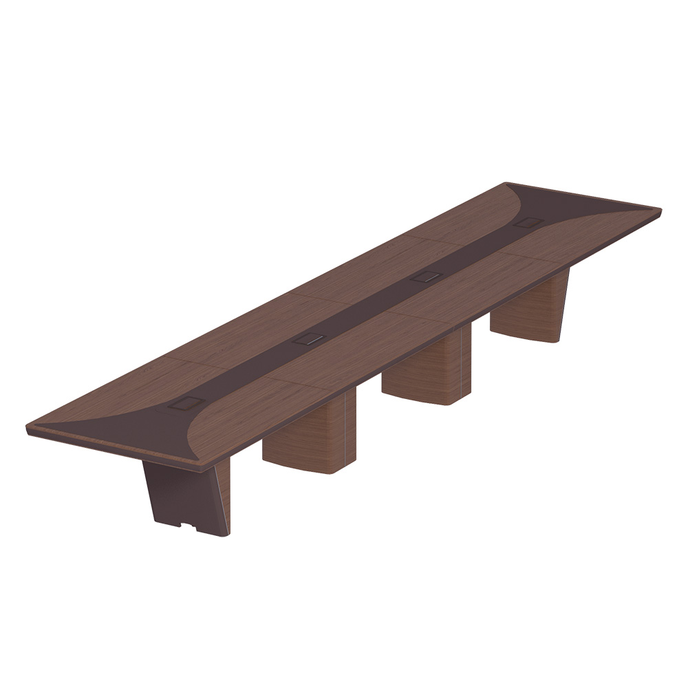 2 колонны, топ и опоры дерево; мет. вставка; кромка,  внешняя часть опор и центр. часть стола в коже; 4 кабель -канала, на 18 мест