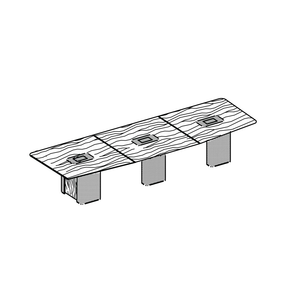 Деревянная столешница, вставка из хромирированного металла, 3 колонны и кабель-каналы, обтянутые кожей; на 14 мест