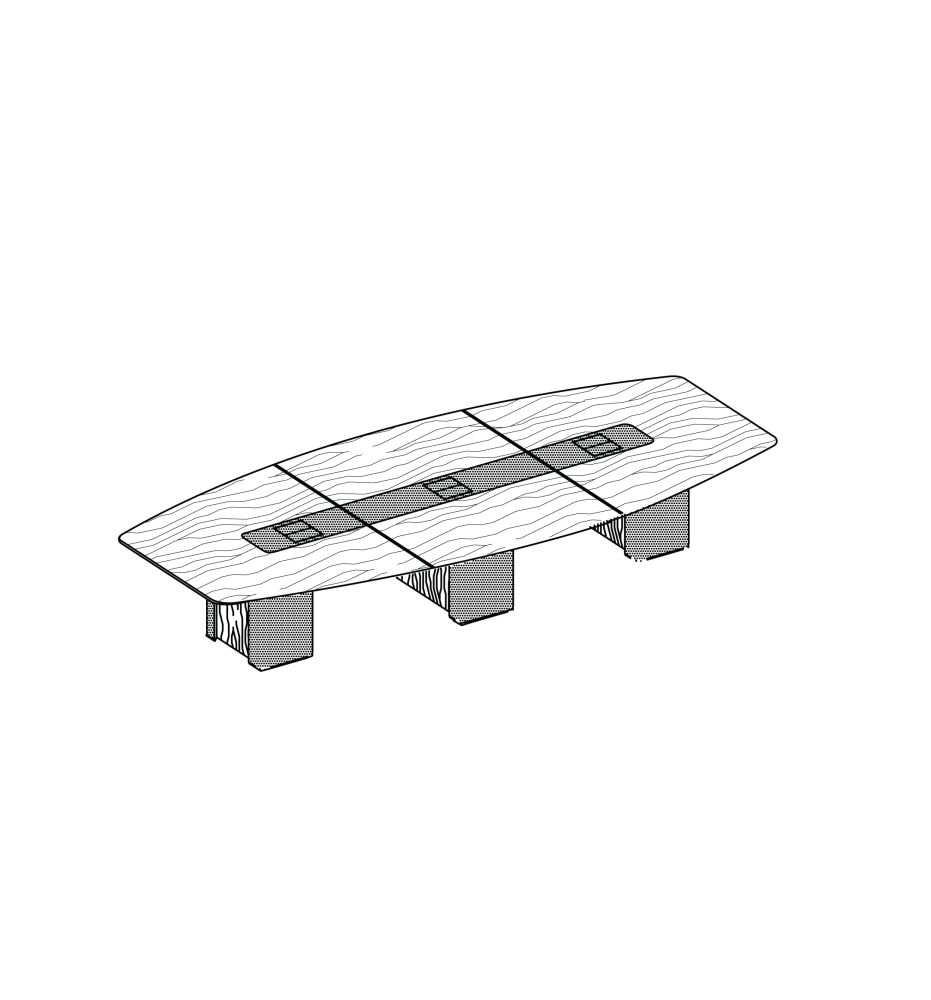 Деревянная столешница, вставка из хромированного металла, 3 колонны и кабель-каналы, обтянутые кожей; на 14 мест