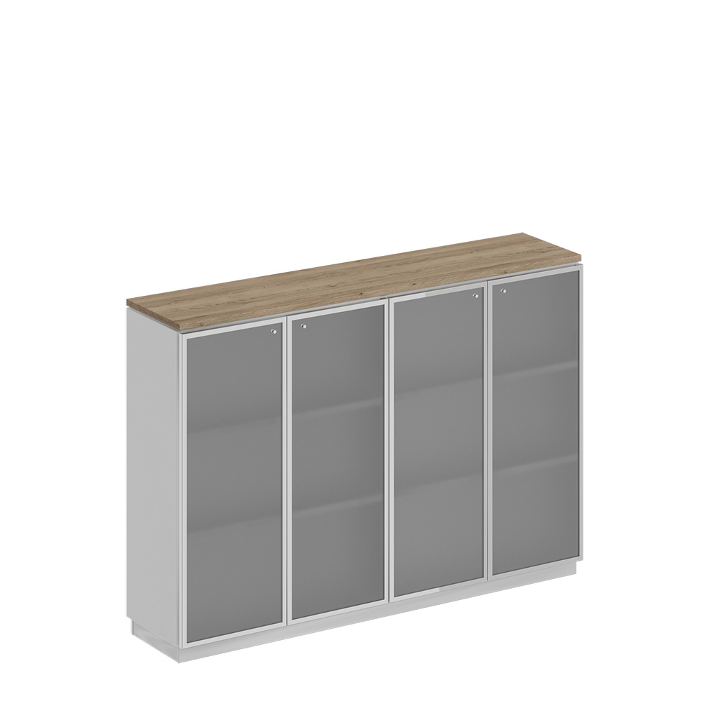 - Шкаф укомплектован четырьмя дверями со стеклом в металлической рамке без замка.