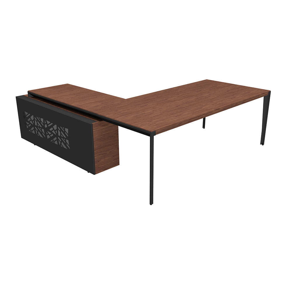 Особенности: индивидуальность стола подчеркивает опорная тумба, заднюю стенку которой можно выполнить в шпоне, стальной накладке с перфорацией или же в лакировке в любом цвете по системе RAL.