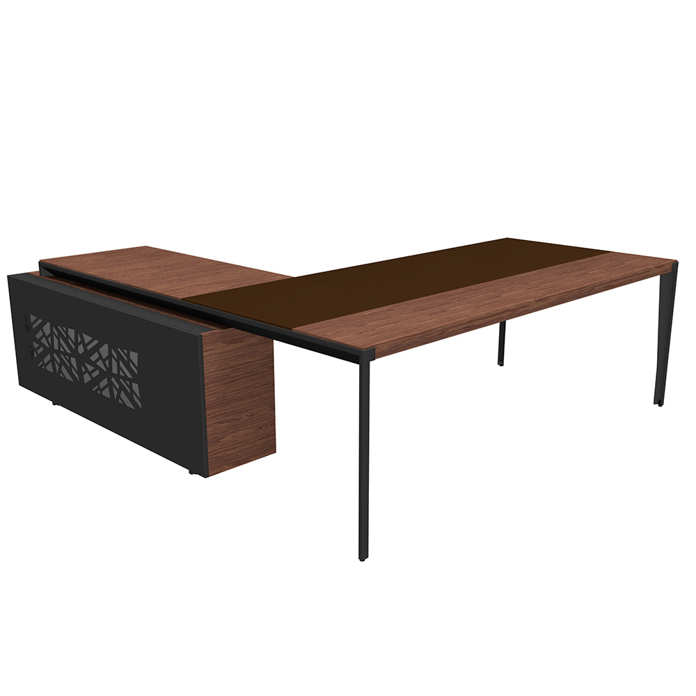 Особенности: индивидуальность стола подчеркивает опорная тумба, заднюю стенку которой можно выполнить в шпоне, стальной накладке с перфорацией или же в лакировке в любом цвете по системе RAL.