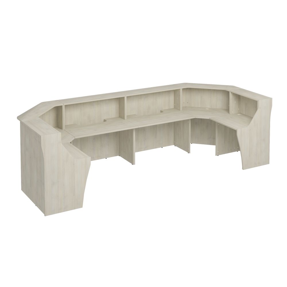 - Угловая стойка ресепшен укомплектована двумя угловыми модулями, двумя прямыми модулями длиной 120 см и двумя прямыми модулями длиной 80 см