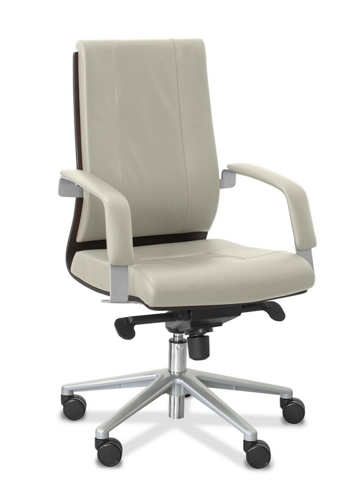Тонкий, изящный силуэт, строгие швы чехла, спинка и боковые поверхности отделаны натуральным шпоном в цвете «венге» или «беленый дуб». В линейку кресел входит: кресло руководителя, кресло посетителя с низкой спинкой, кресло посетителя на полозьях.
